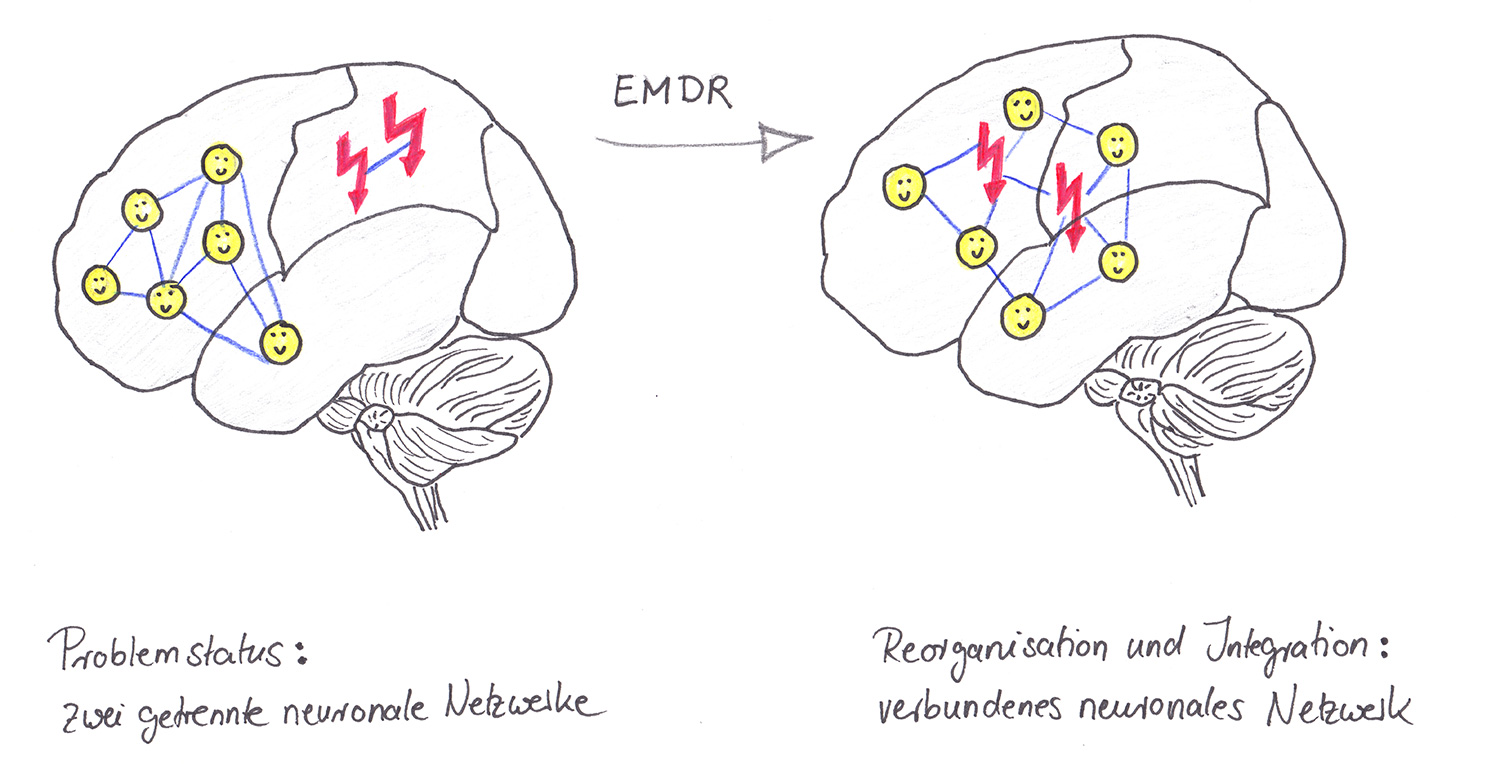 Aus der Schlafforschung ist bekannt, dass sich in der Schlafphase, in der wir träumen (REM-Phase= Rapid Eye Movement), unsere Augen schnell und rhythmisch link-rechts hin und her bewegen und wir dadurch Erlebtes verarbeiten können. Diese sogenannte bifokale Bewegung synchronisiert unsere beiden Gehirnhälften und ermöglicht die Verbindungen von Netzwerken- d.h. die der bisher isolierten Netzwerke mit dem Belastungsmaterial zu den positiven Netzwerken. Diese Integration ermöglicht eine Neuverarbeitung und eine Neubewertung eines belastenden Ereignisses.